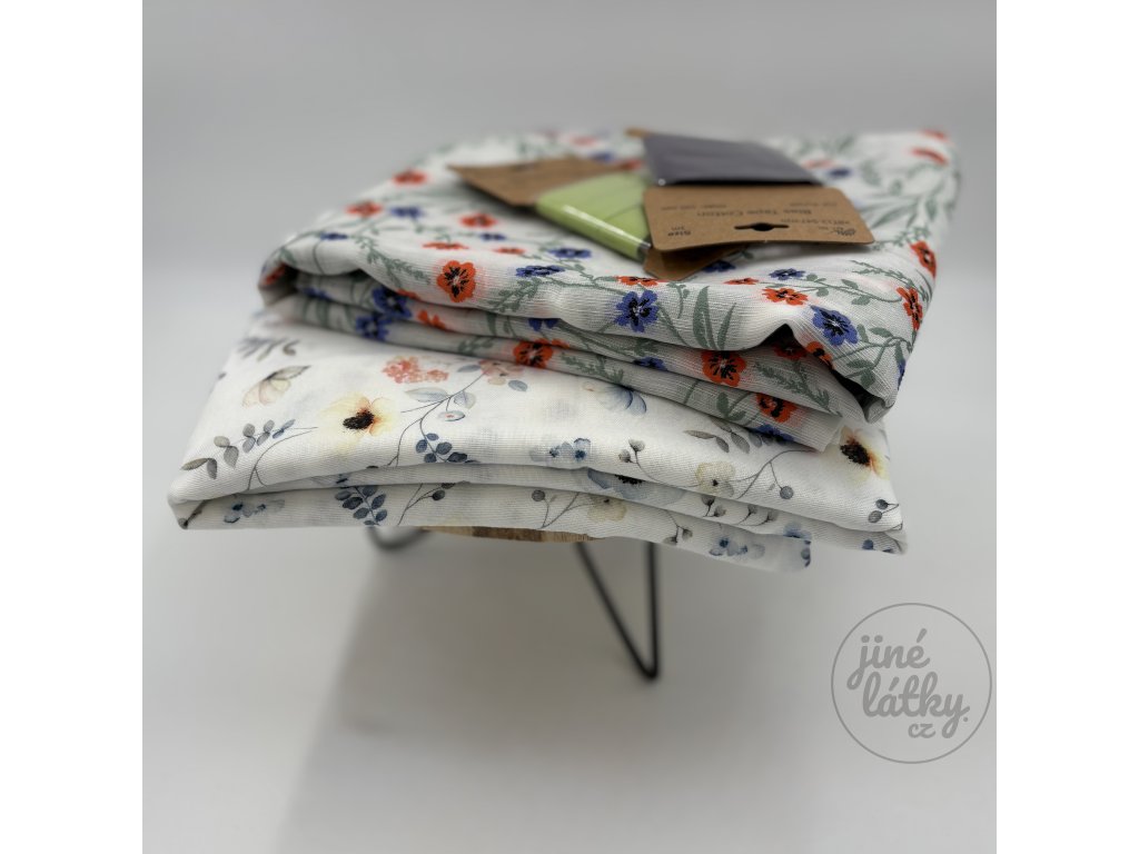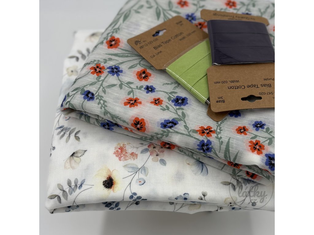 Balíček obsahuje dva druhy látek a bavlněné lemovky.