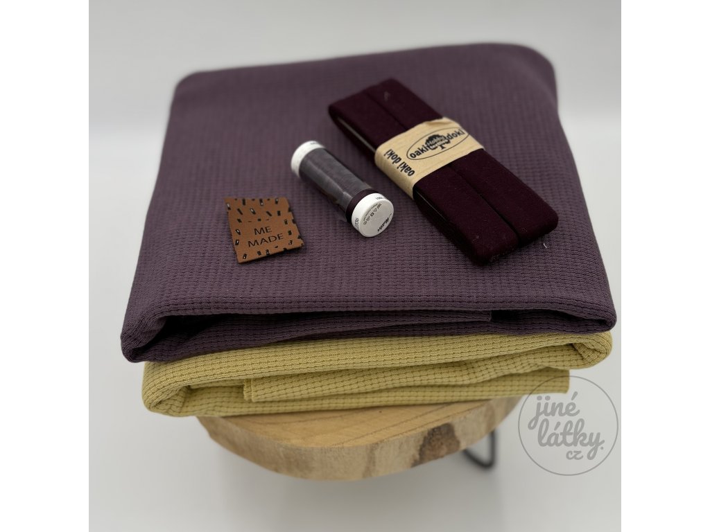 Balíček obsahuje dvě barevné varianty látek, úpletovou lemovku, textilní štítek a ladící nit Metter.