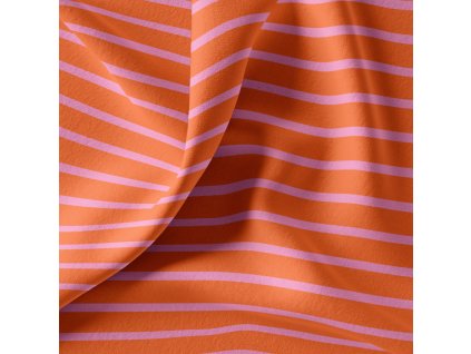 CANDY – proužkovaný bavlněný úplet v růžovo‑oranžové – hebký, pružný, dokonalý pro Váš šicí projekt! Zažijte radost z látky, která inspiruje: Představte si příjemný dotek...