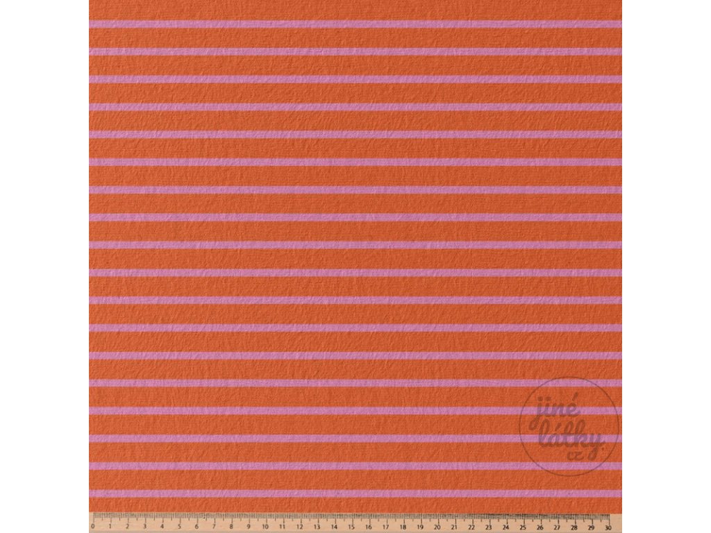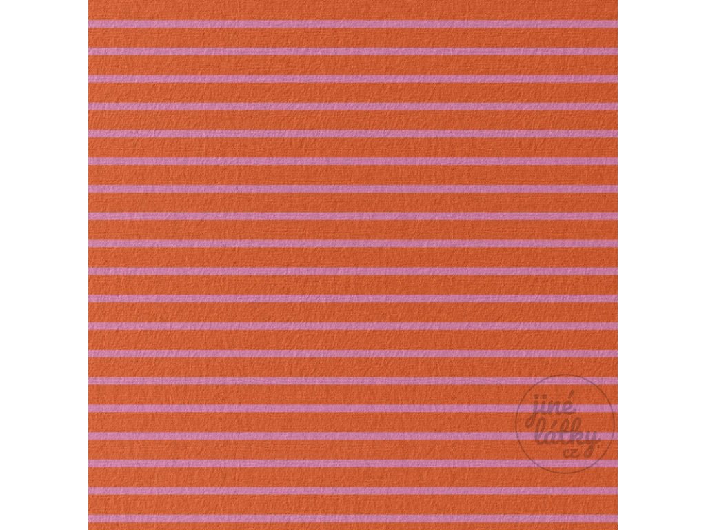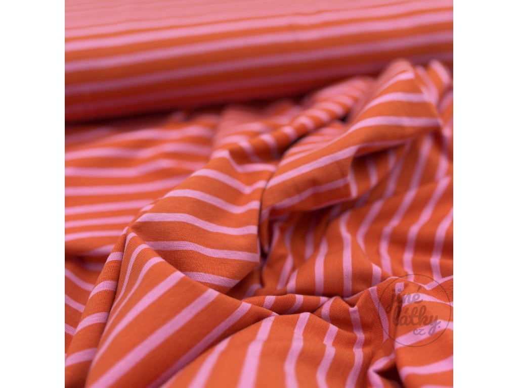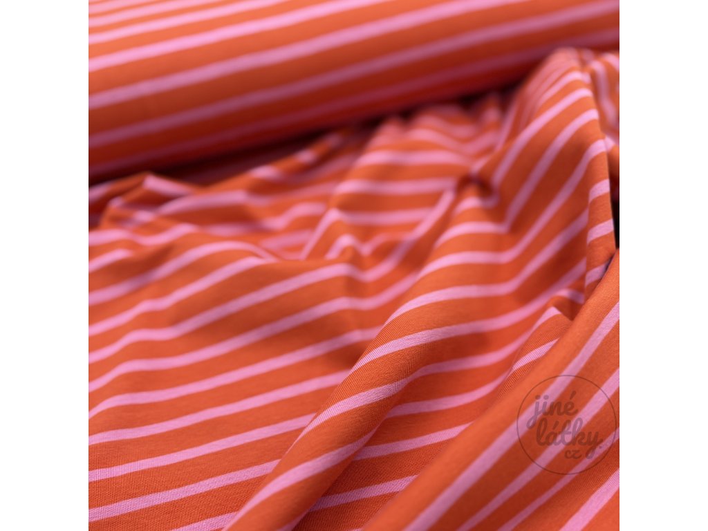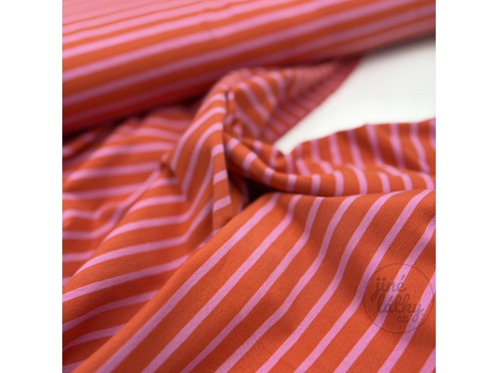 CANDY – proužkovaný bavlněný úplet v růžovo‑oranžové – hebký, pružný, dokonalý pro Váš šicí projekt!