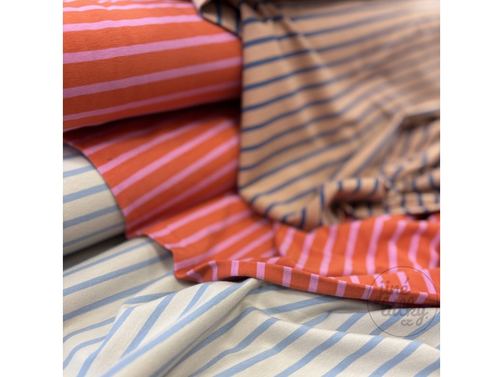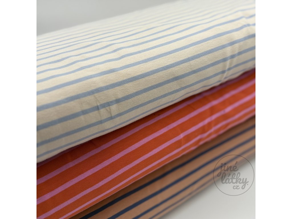 SEA – proužkovaný bavlněný úplet v pískovo - světle modré barvě – hebký, pružný, certifikovaný Zažijte radost z látky, která inspiruje Představte si příjemný dotek látky na...
