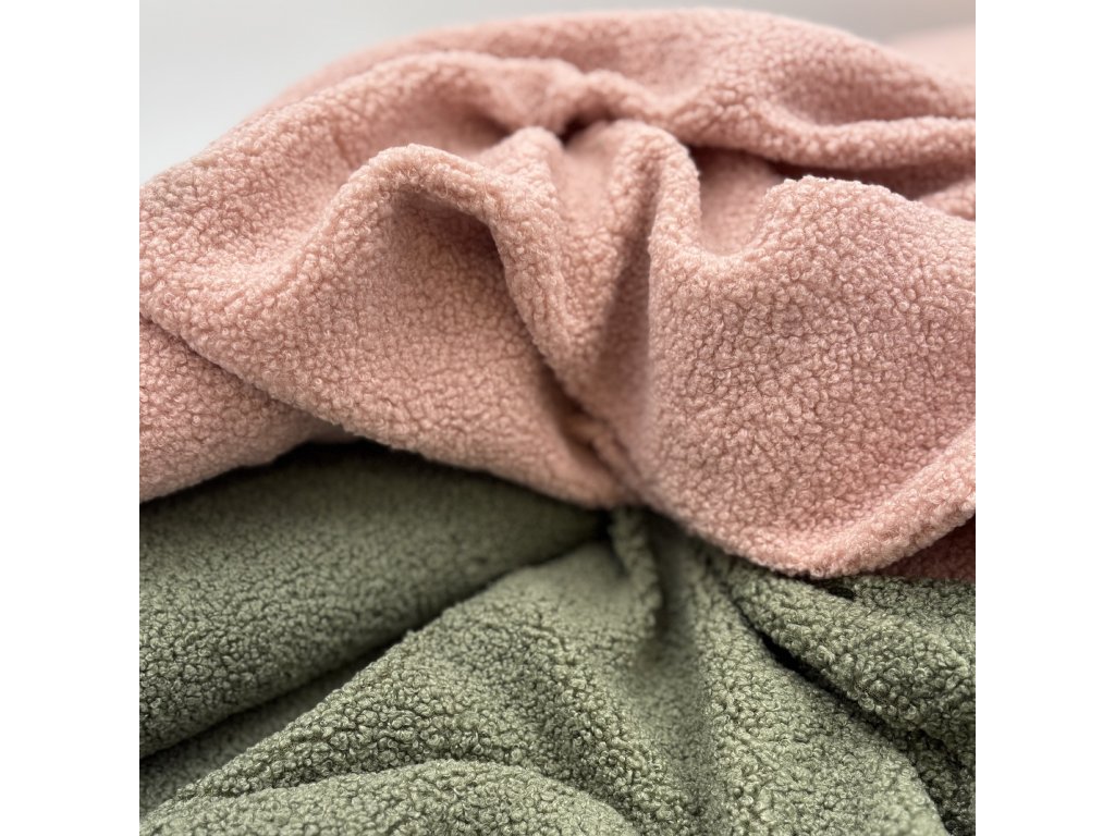 Materiál „beránek“ či teddy látka má kořeny v imitaci kožešin. V posledních letech se však stal módním hitem — často se využívá v udržitelných kolekcích, jako výplňový materiál i jako výrazný povrchový textil. Růžový odstín dodává jemnost, hravost a současně stylový akcent.