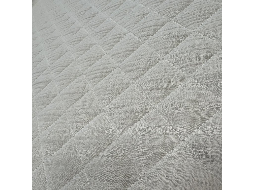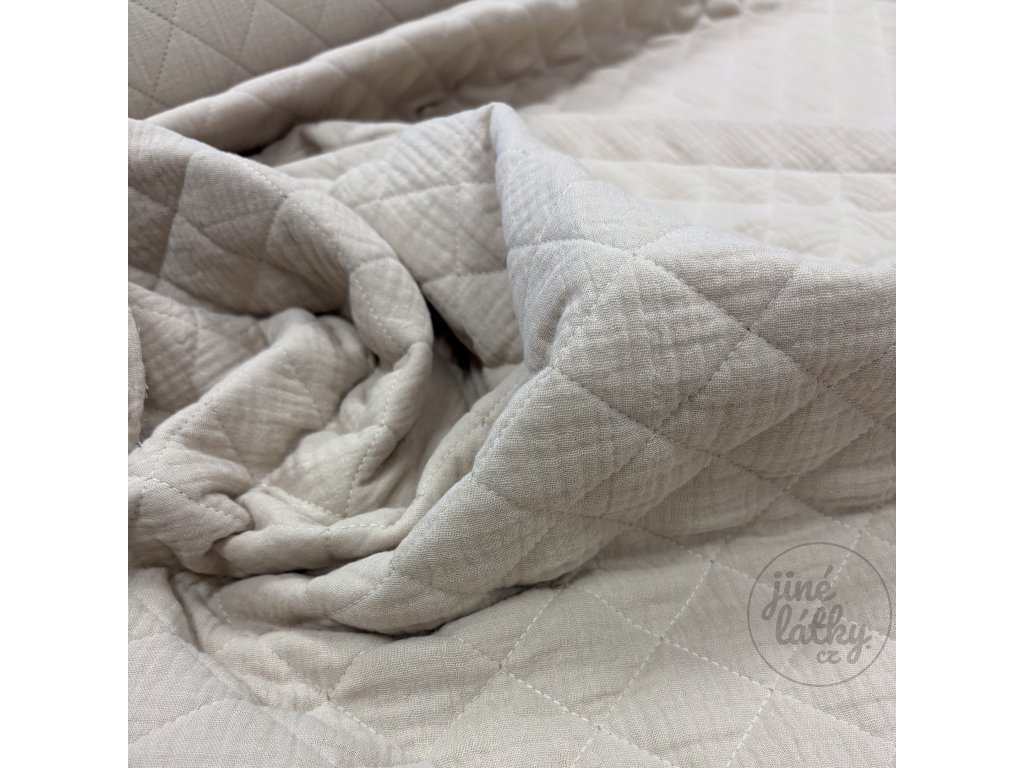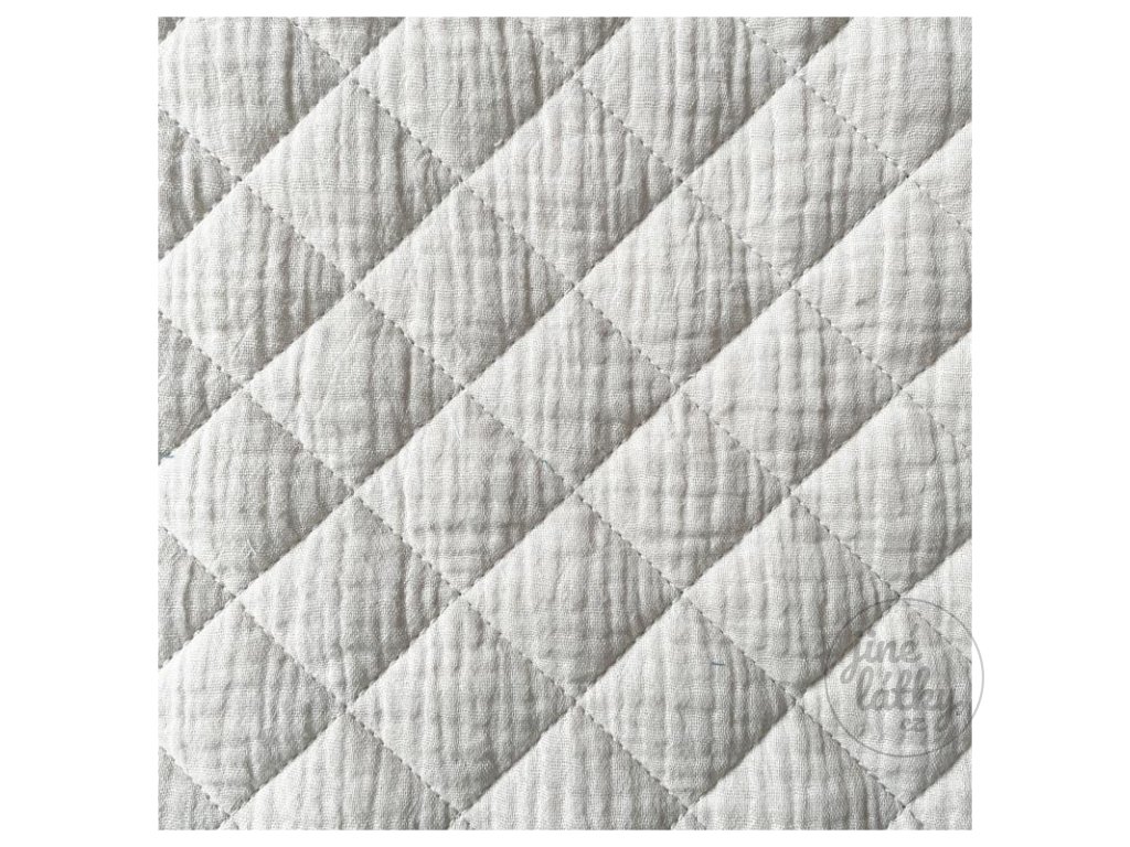 Každá plocha oboustranného mušelínu tvoří dvě vrstvy jemné bavlněné látky a mezi nimi je vsazen polyesterový výplňový materiál. Výsledkem je strukturovaný prošívaný efekt, který drží tvar a zároveň je vzdušný.